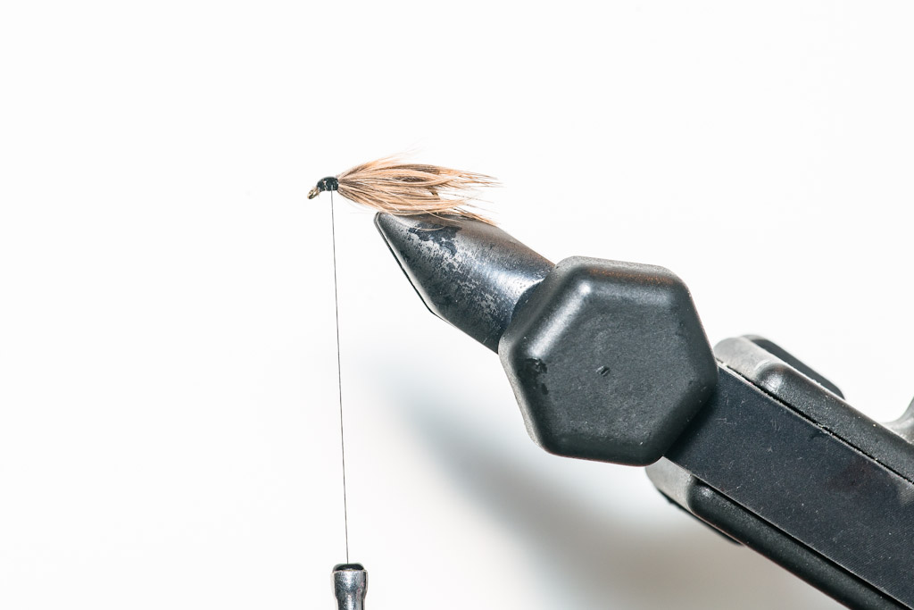 4. Tie in the CdC feather by the smallest end at the curve of your hook
