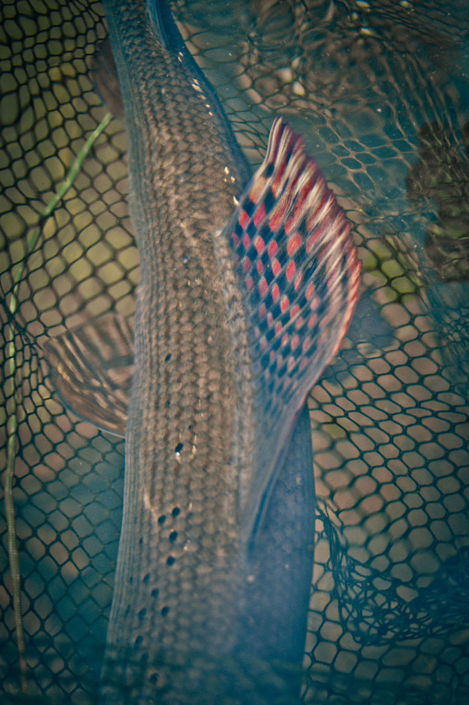 I can remember some nice strikes ! Specially one for Yann .. Maybe under 2.5m of water, 6/7m in front of us, almost no current, the drift starts maybe 8/10m upstream, very small nymph, 3.5m tippet 2X .. You see what I mean ? Everything is in slow motion, and at the second attempt it happens, we can see this so small movement of head, I cannot say anything, but Yann also knows, he set and here it is .. the mouth open widely, the head starts shacking, and now SHE knows, and she goes !
